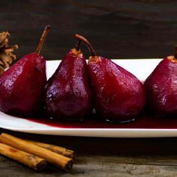 Add the port wine to the syrup and simmer for a few minutes, then pour over the pears. Refrigerate covered.